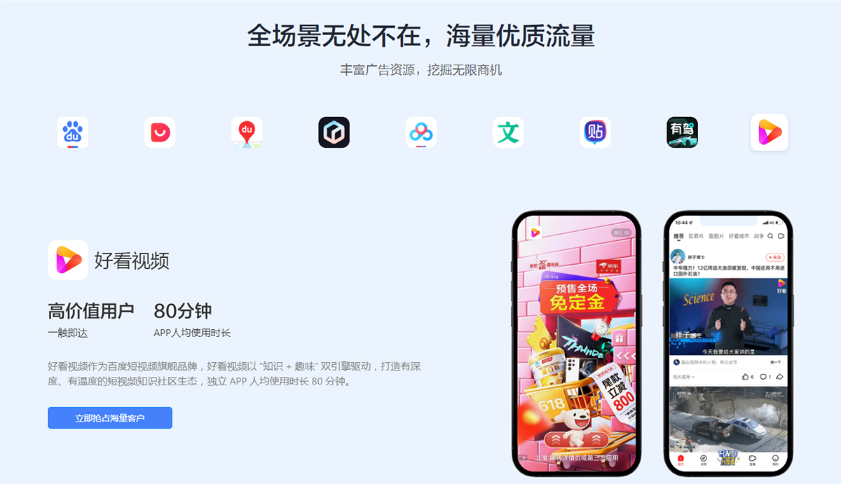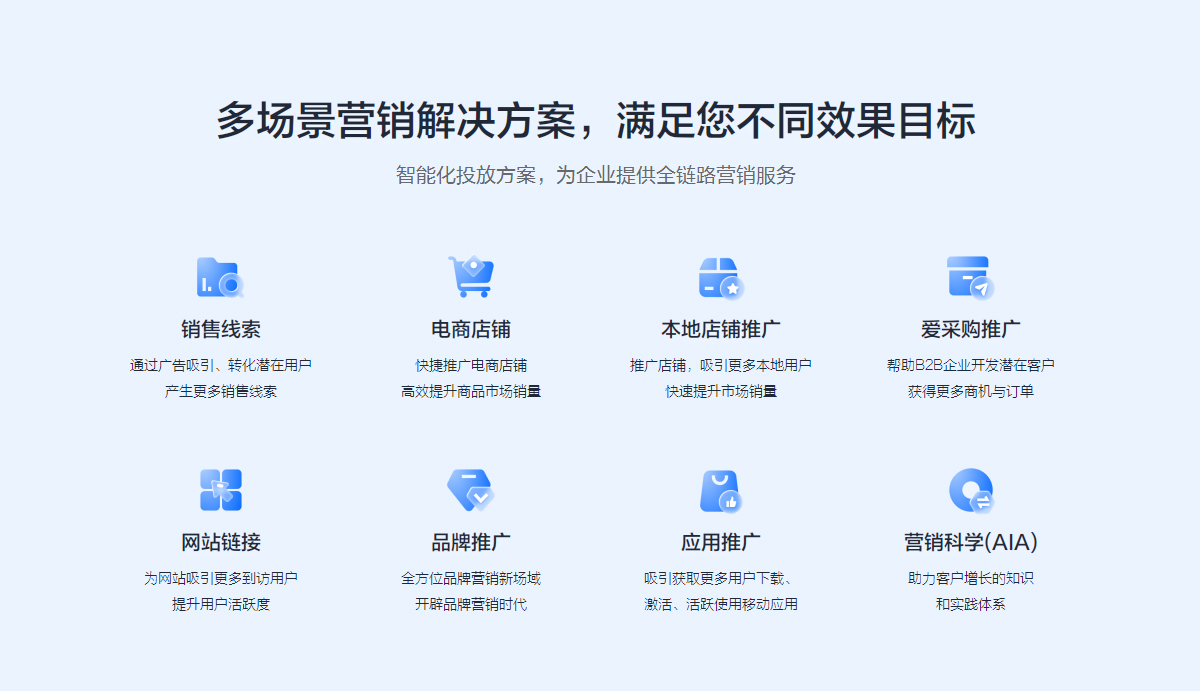 多场景营销解决方案,满足您不同效果目标,百度推广智能化投放方案,为企业提供全链路营销服务